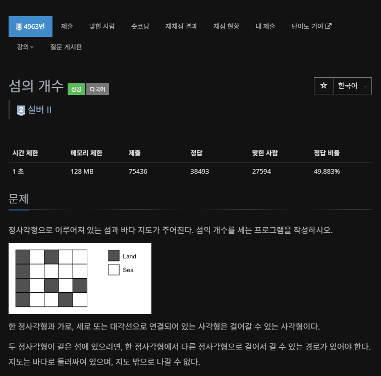 - 섬의 정의는 상하좌우 대각선 8방향과 인접한 땅이 있다면 그 부분을 하나의 섬으로 본다.