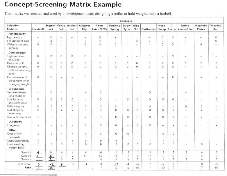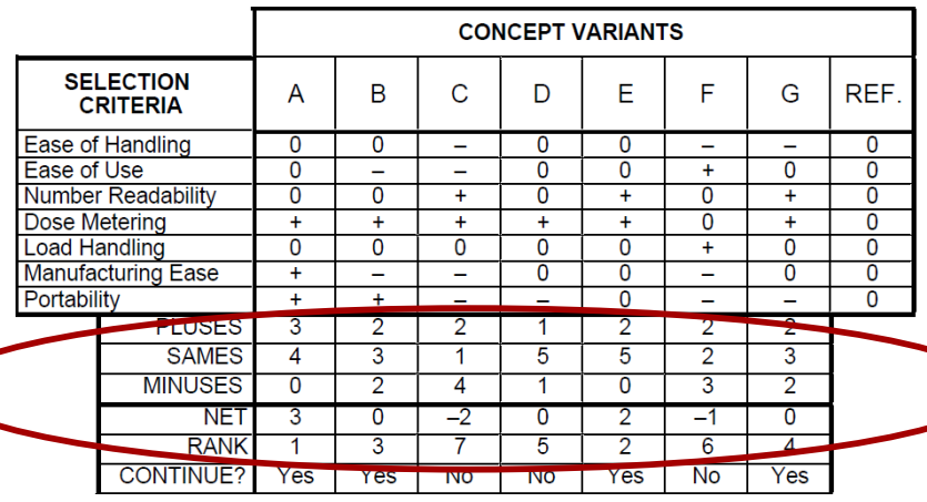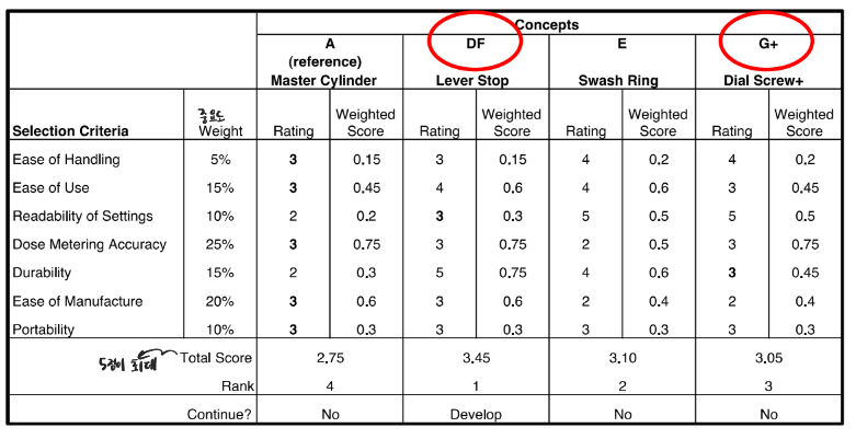 1980년대 Stuart Pugh에 의해 개발된 방법론에 기반한 컨셉선별표(Concept Screening Matrix)를 활용