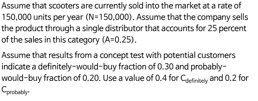 1. 총판매량은 (시장 크기)*(접근성)*(구매 확률)로 나타낼 수 있음 2. 또한 위의 지문에서 Cdef=0.4, Fdef=0.3, Cprob=0.2, Fprob=0.2이므로 P는 04*0.3+0.2*0.2=0.16이다. 3. Q=150,000*0.25*0.16=6,000이다.