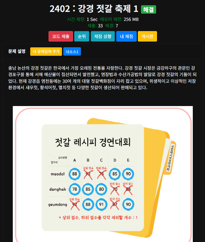 강경 젓갈 축제 (0), (1), (2) - (BOJ 기준 실버 3~실버 1?)(자료 구조, 정렬)