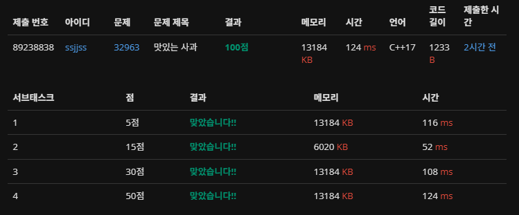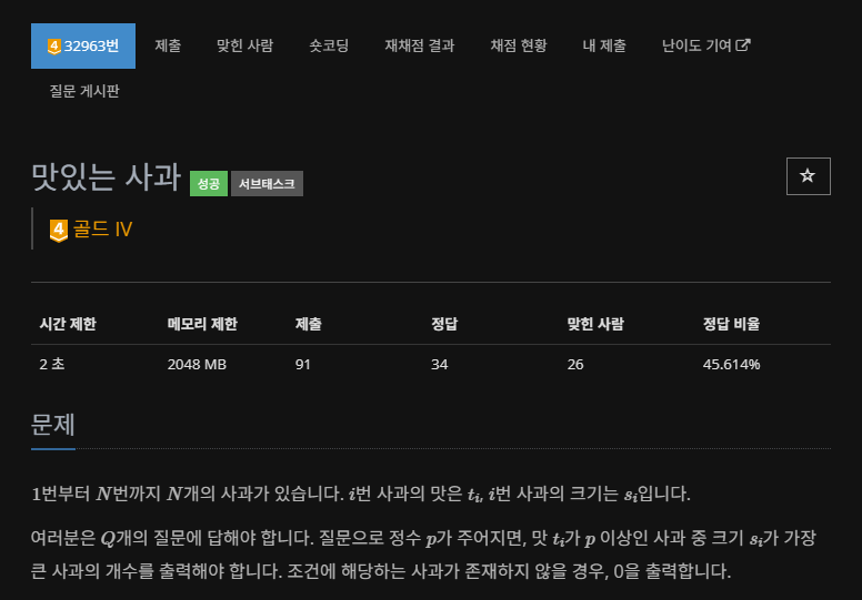 - 우선 사과의 맛(t)을 기준으로 내림 차순으로 정렬해 준다.