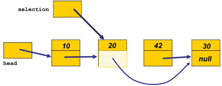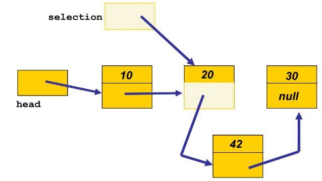 - element=42를 해주고 link=seletection.link로 해준다면 20이 가리키고 있는 30의 IntNode를 가리키게 된다.