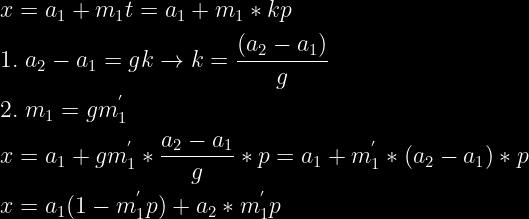 i128 t2 = ((i128)a2 * (m1 / g) % mod) * p % mod;