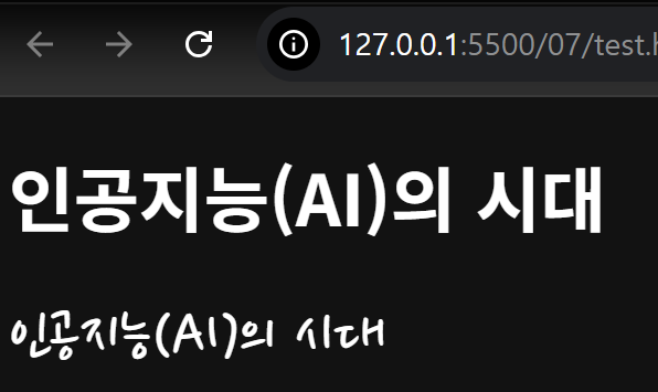 2. 한국어 영어 모두 가능하기 때문에 Nanum Pen Script를 찾아서 get embed code를 클릭해 줌3. 이후에 @import 속성이 보이도록 해서 브라우저 창을 열어줌. 다음에 코드를 복사해 주어서 복사 붙여 넣기 해줌. <!DOCTYPE html> <html lang="ko"> <head> <meta charset="UTF-8"> <title>ssjjss</title> <style> @import url('https://fonts.googleapis.com/css2?family=Nanum+Pen+Script&display=swap'); .nanum-pen-script-regular { font-family: "Nanum Pen Script", cursive; font-weight: 400; font-style: normal; } </style> </head> <body> <h1>인공지능(AI)의 시대</h1> <h1 class="nanum-pen-script-regular">인공지능(AI)의 시대</h1> </body> </html>