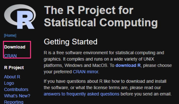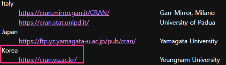 - 왼쪽 상단에 있는 Download 항목에서 CRAN을 선택해 준다.