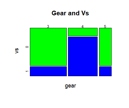 mosaicplot(~gear+vs, data=mtcars, color=c("green","blue"),main="Gear and Vs")