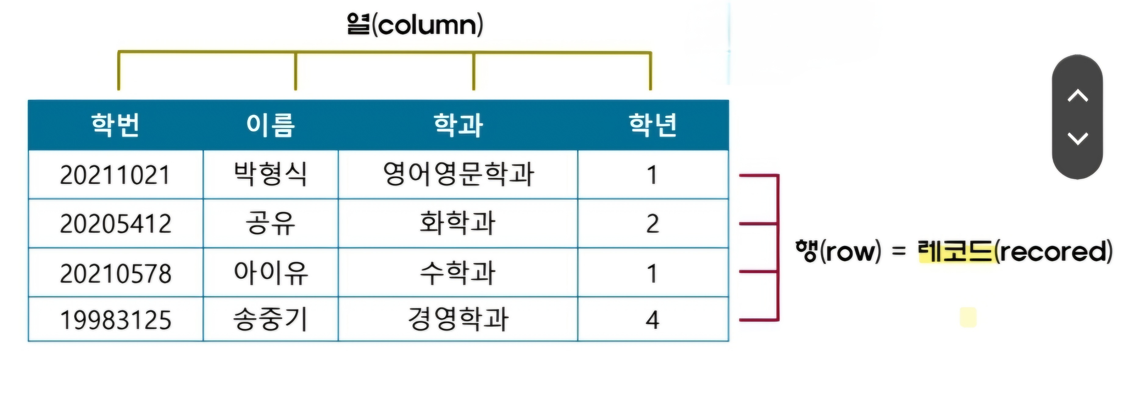 - 열: 특정 자료형을 가지는 데이터 값(표의 세로축)