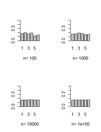 barplot(y/i, ylim=c(0,0.5), xlab=paste("n=",i))
