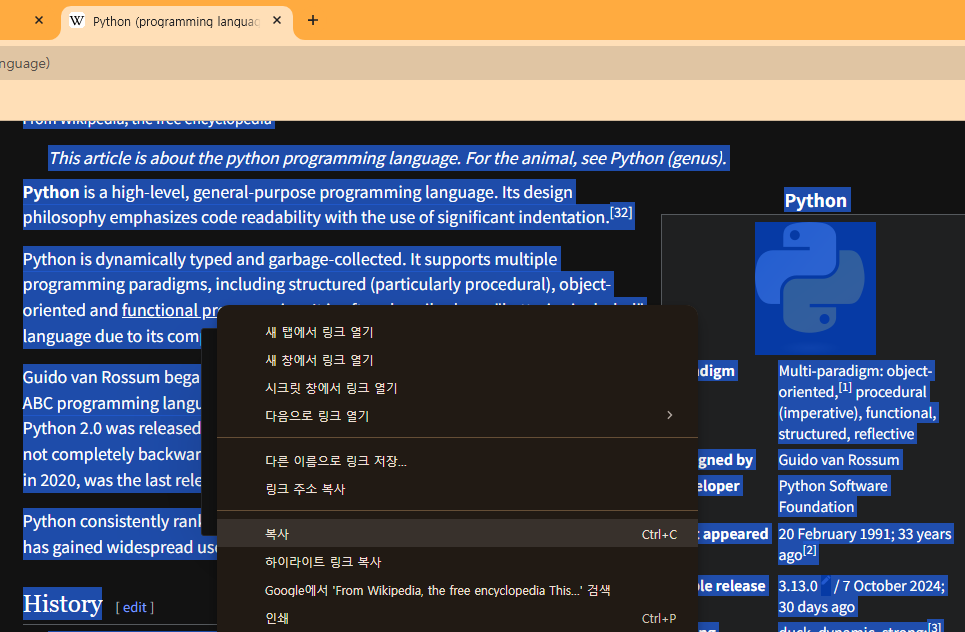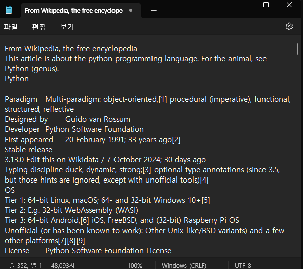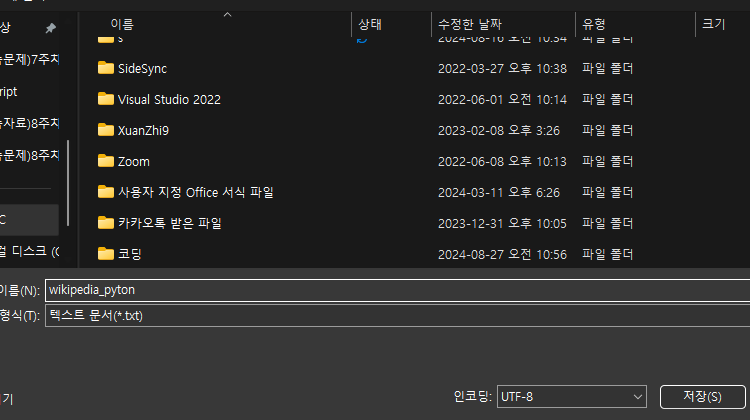 wikipedia python 검색텍스트 복사하기텍스트를 메모장에 붙여넣기이름 변경 후 UTF-8로 저장해주기