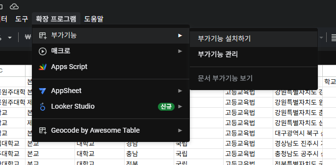 이 부분에서 위도와 경도, 학교명에 해당하는 데이터를 한 번에 가져오기 위해서 iterrows를 사용한다. iterrows 같은 경우에는 열-값 형태로 변환해 준다.