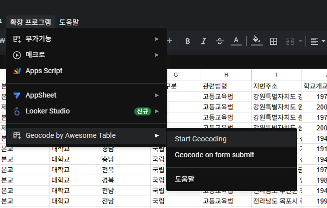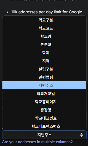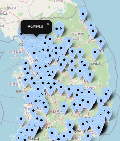 그런 다음 위도, 경도, 학교명을 하나씩 가져와서 Marker를 활용하여서 지도에 표시해 준다.
